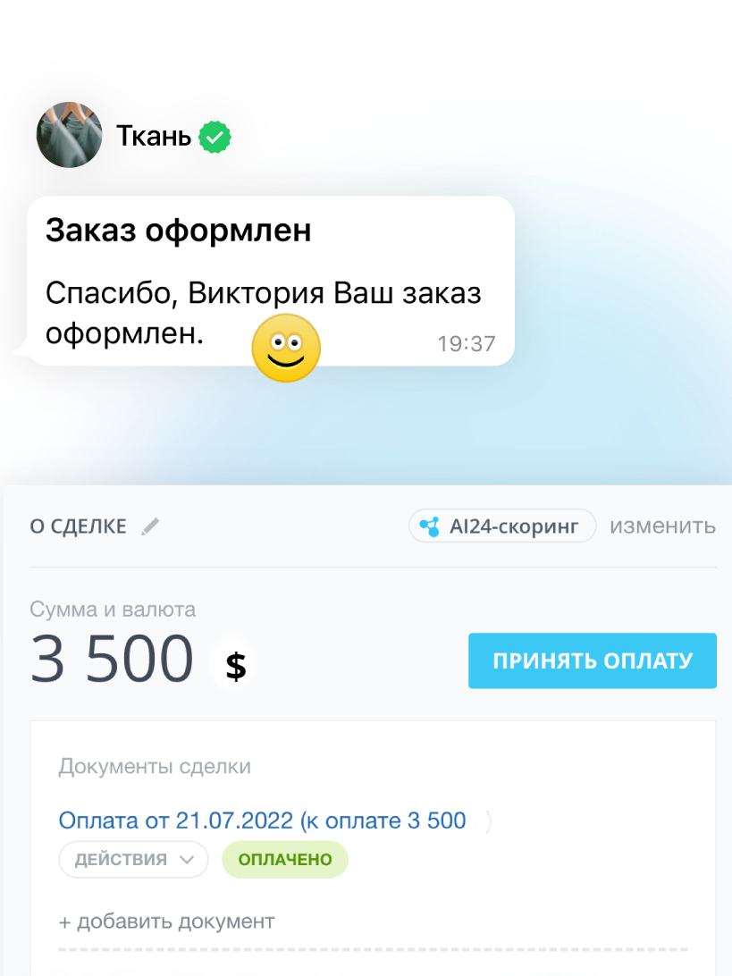 Всё необходимое для продаж уже есть в CRM. Ведите складской учёт, реализуйте товары и контролируйте остатки. Выставляйте счёт на оплату и оформляйте доставку прямо из карточки сделки – клиент сможет оплатить прямо в диалоге с вашей компанией.